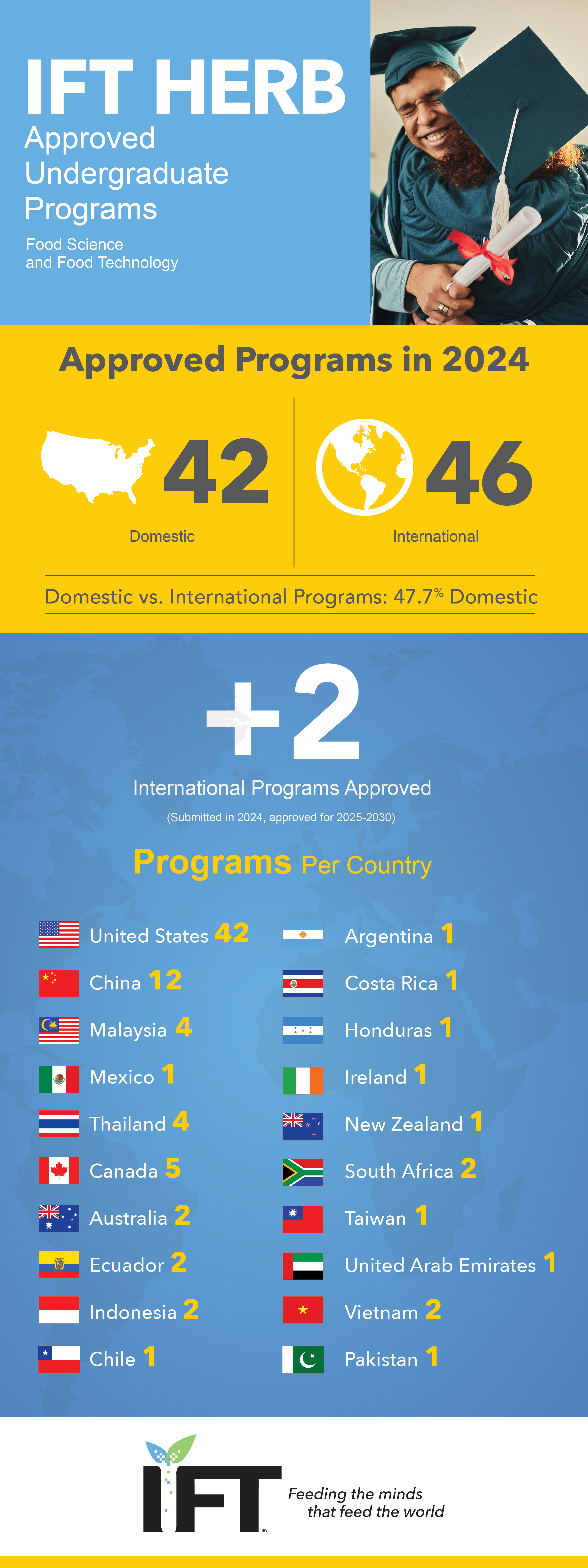 The IFT Higher Education Review Board (HERB) has approved 2 new international programs for 2025-2030, for a total of 42 domestic and 46 international food science & food technology undergraduate programs.